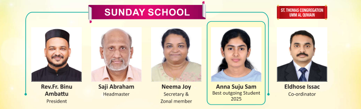 “Train up a child in the way he should go, and when he is old he will not depart from it” Proverbs 22:6. These ‘Words of Wisdom’ from King Solomon serve as the guiding precept of Our Sunday School commenced its functioning in the year 1981, with a limited number of students in one common class. From this humble beginning, it has now completed 35 years of commendable service in ‘Spiritual Empowerment’. Around 700 students are currently studying in our Sunday School from Grade KG1 to Grade XII, and 40 teachers are actively participating in the task of enlightening and fostering them, as true and faithful Christians. The academic year of our Sunday School commences every January and classes are conducted every Friday after the Holy Qurbana from 10.45 a.m. to 12.30 p.m. Prior to classes, assemblies are conducted separately for kindergarten, juniors & intermediates and seniors, teaching them devotional songs, church hymns and prayers. The Sunday School follows the Malankara Jacobite Syrian Sunday School Association (MJSSA) curriculum and merit certificates issued by MJSSA are awarded to outgoing students of classes X and XII every year. The Sunday School conducts several facilitating sessions on a regular basis, to empower its students to successfully face life’s various challenges. Students’ Retreat and Counselling session A retreat for senior Sunday School students, to acclimatize themselves towards the challenge of School Board Examinations, is held every year in the month of February. Empowerment session, prayer and meditation etc. are conducted during the retreat, followed by provision of various learning tips by experienced teachers. A dedicated counselling session for Sunday School students is also conducted by the church during the month of October, every year. The Jacobite Syrian Vacation Bible School (JSVBS) The JSVBS has been conducted in our Sunday School on an annual basis, during the month of March, since the year 2009. The JSVBS, based on themes provided by MJSSA, is led by skilled priests and around 500 students and 60 teachers actively attend the JSVBS every year. On the JSVBS final day, a colourful rally and impressive cultural programmes are presented by students from various classes. Talent Fests The Annual Sunday School Talent Fest is conducted in the month of May and competitions are held for various student groups for Church hymn, Christian devotional songs, Elocution, Bible test, Memory verse writing and Quiz. Our Sunday School regularly participates in the Annual U.A.E. Inter-Sunday School Talent Fest and has now won the overall championship trophy for seven times in a row. Also, our students have regularly won the individual championships. Examinations, Open House and Parent-Teacher Meeting The Sunday School Half Yearly examinations and Open House are conducted in the month of June and the final examinations and Open House are conducted in the month of December every year. A Parent–Teacher Meeting is also held in the month of December, prior to the Open House. Annual Day celebrations The Annual Day celebration of our Sunday School is held during the month of December and students from various classes present several cultural programmes of grandeur on this day. Trophies and merit certificates are awarded to the winners of ‘Talent Fest’, as well as toppers in the examination and attendance. The Sunday School teachers who have completed 10 years of meritorious service are also felicitated by the church on the Church Parish Day. Mor Gregorios Jacobite Students’ Movement (MGJSM) MGJSM, the students’ movement of Jacobite Syrian Christian Church, has been actively functioning in our Sunday School since 2010. Every Friday separate Sunday School Assemblies are conducted under the auspices of MGJSM and students portray their dynamic leadership qualities and ability to execute various innovative programmes by conducting skits, quizzes, group songs, reviews, debates etc. on a class-wise basis. St. Mary’s Children’s Library The Sunday School library, with a collection of more than 750 books, nourish the spiritual reading and learning needs of the students and functions every Friday after Sunday School classes. MJSSA-UAE Events Our Sunday School teachers regularly attend the Annual MJSSA-UAE General Body Meetings and actively participate in the teachers’ training and conference camps, held every year. Our students also participate in the Winter Camp, held annually at St. George’sJacobite Syrian Simhasana Cathedral, Al Ain in the month of December. ST. MARY’S JACOBITE SYRIAN SUNDAY SCHOOL – SHARJAH (UAE) TEACHERS CLASS ALLOCATION 2019